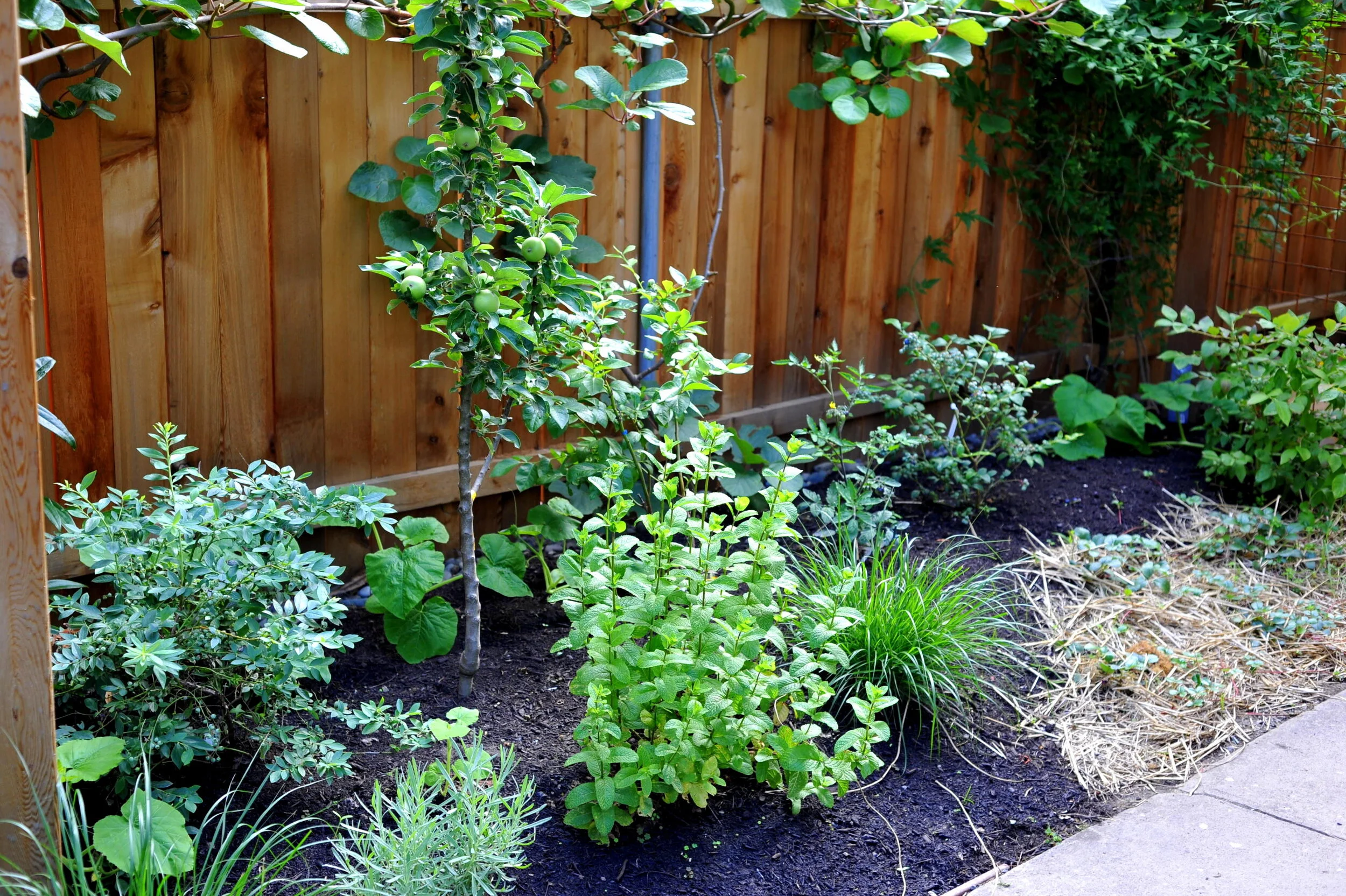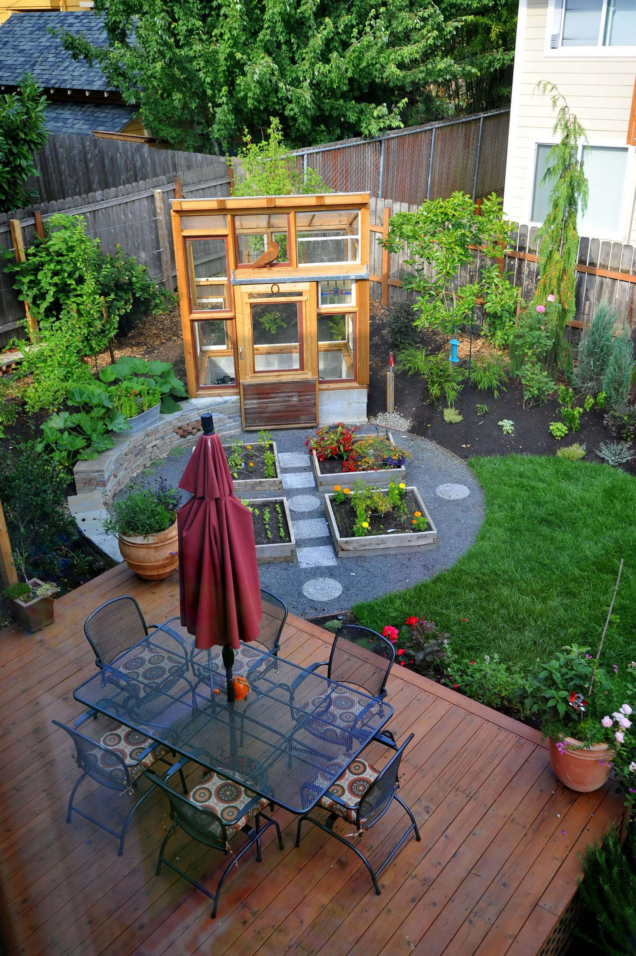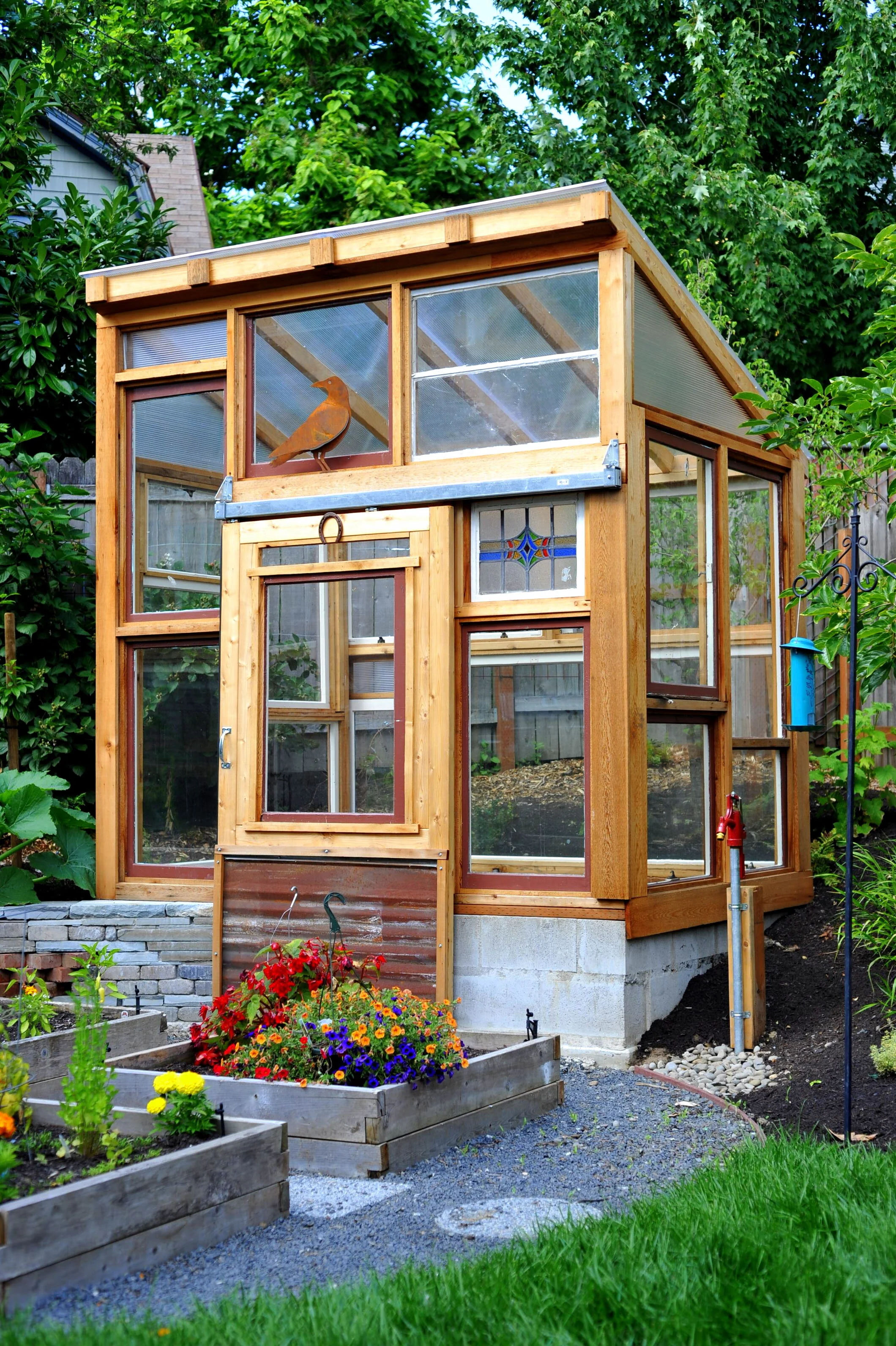 Our urban homestead includes a greenhouse made of reclaimed windows, a rain water storage system, micro-drip irrigation, a space-efficient structure that incorporates a coop, compost bins, a potting bench, a tool shed and will have a green roof. We have a small eco-lawn, permeable paving, a rain garden and over 90 species of edible and medicinal plants.