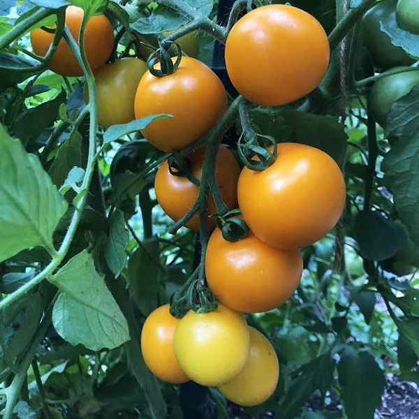 Round orange fruits hang in trusses. Perfect salad or sandwich size. This early bearing variety has been a consistent producer in the unpredictable weather the last few years.